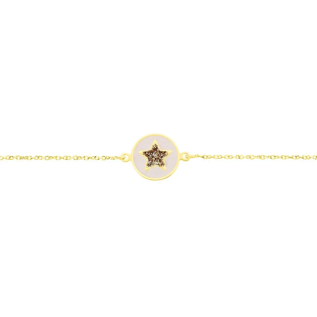 Bracelet Or Jaune 375/1000 Pastille Smalto Rose Etoile Glitter Dore Maille Jaseron 14cm