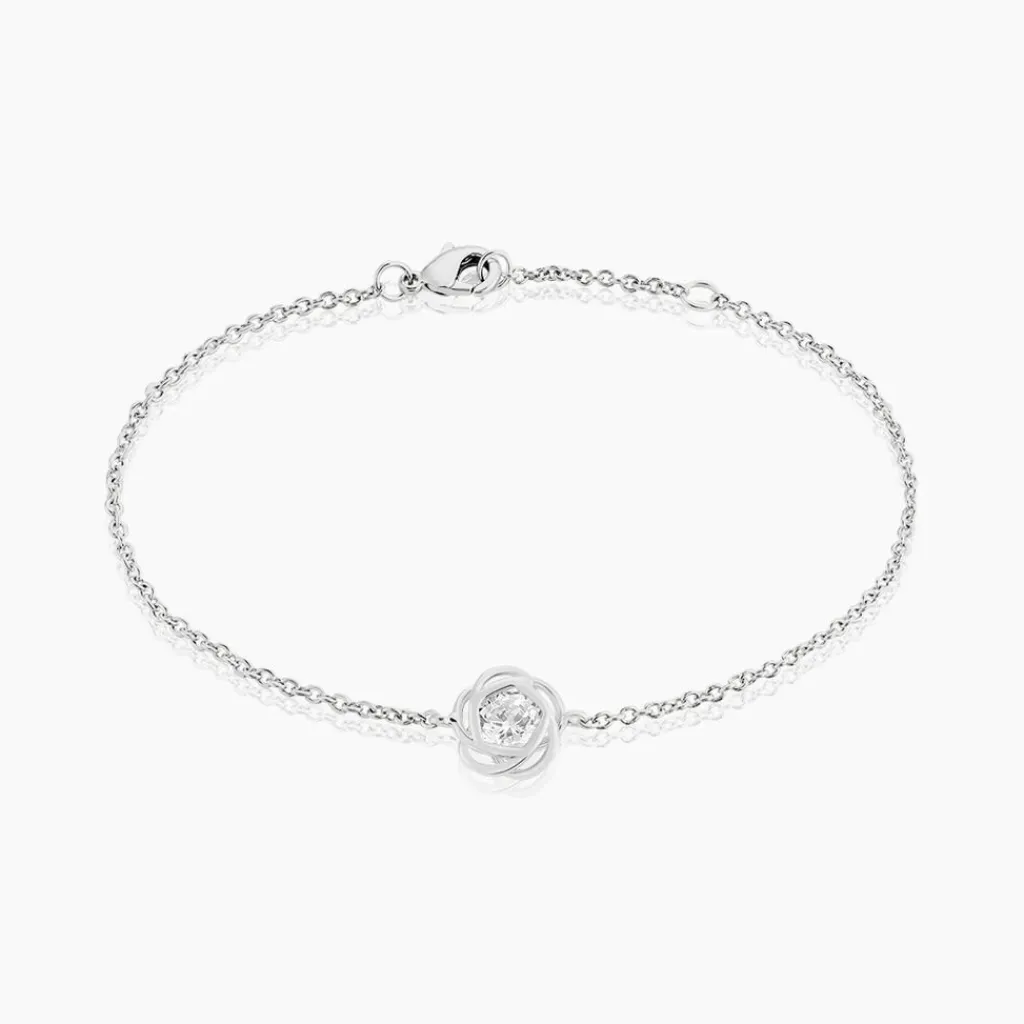 Bracelet Argent Blanc 925/1000 Fleur Oxyde De Zirconium Serti Clos Maille Jaseron 16+2cm