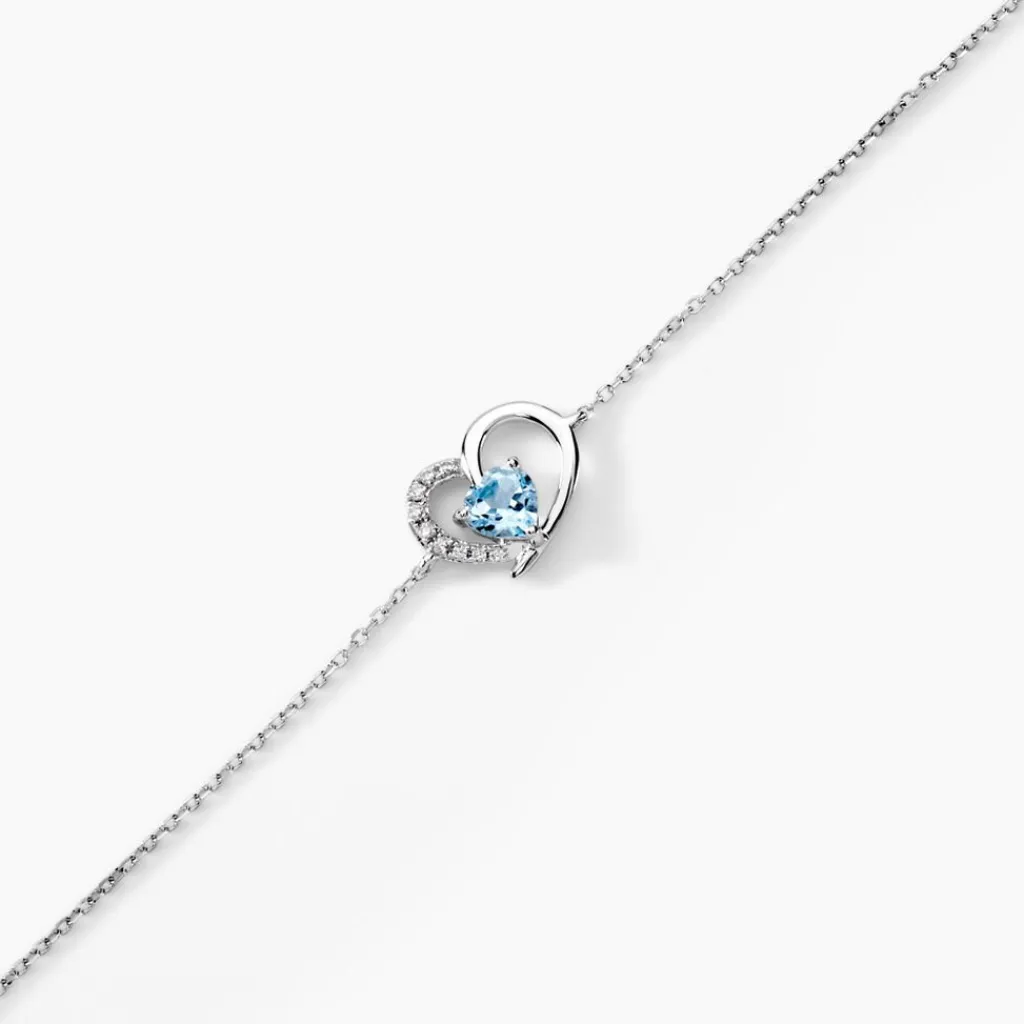 Bracelet Or Blanc 375/1000 Forme C艙ur Topaze Bleue Centrale Et Oxydes De Zirconium 19cm