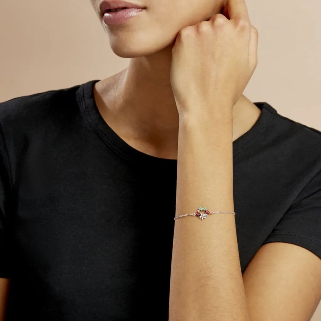 Bracelet Argent 925/1000 eliniane Cercle Motifs Fleurs Et Coccinelles Email Rouge Blanc Et Vert+oxydes De Zirconium 18cm