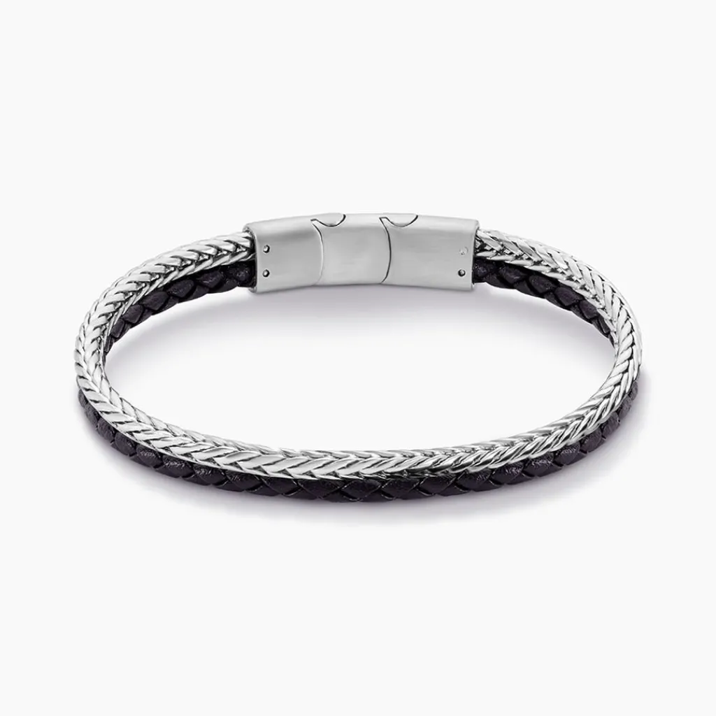 Bracelet Acier Inoxydable Blanc Cordon Tresse Cuir De Vache Noir Et Maille Palmier Largeur 4Mm 21Cm