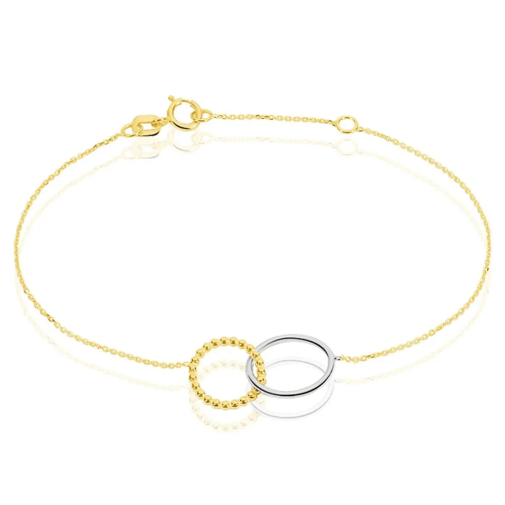 Bracelet Or Bicolore 375/1000 Double Cercles Ajoures Effet Perle Et Lisse Maille Jaseron 18cm