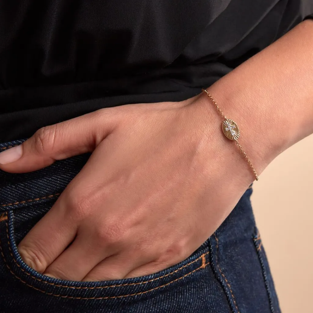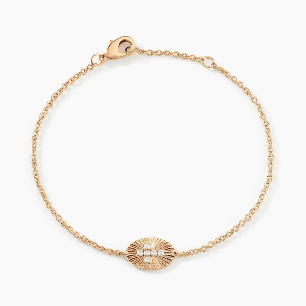 Bracelet Plaque Or Ovale Strié Motif Croix Pavage Oxydes De Zirconium Maille Forcat 16+2cm
