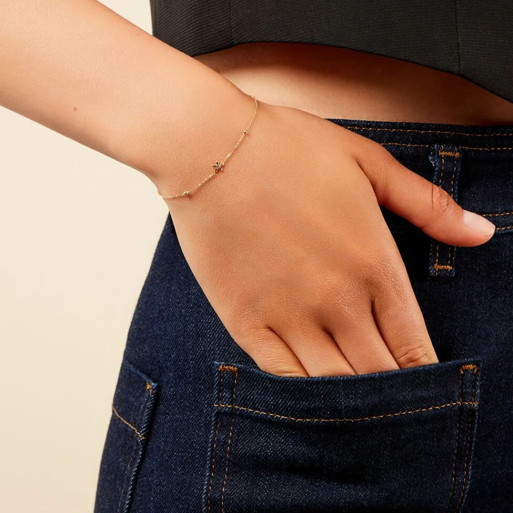 Bracelet Or Jaune 375/1000 Fleur Oxyde De Zirconium Et Boules Maille Jaseron 14+2cm