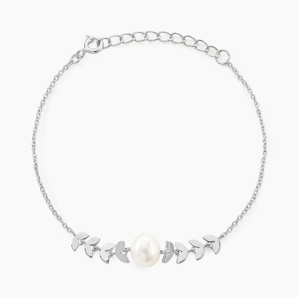 Bracelet Argent 925/1000 Perle De Culture Et Feuilles Articulées Maille Forçat 19cm