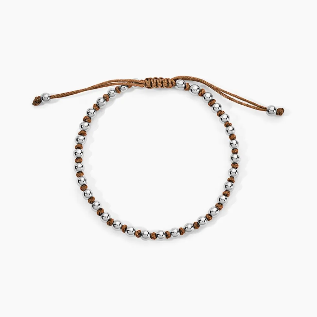 Bracelet Acier Inoxydable Blanc Boules Et Cordon Nylon Marron 18-27Cm