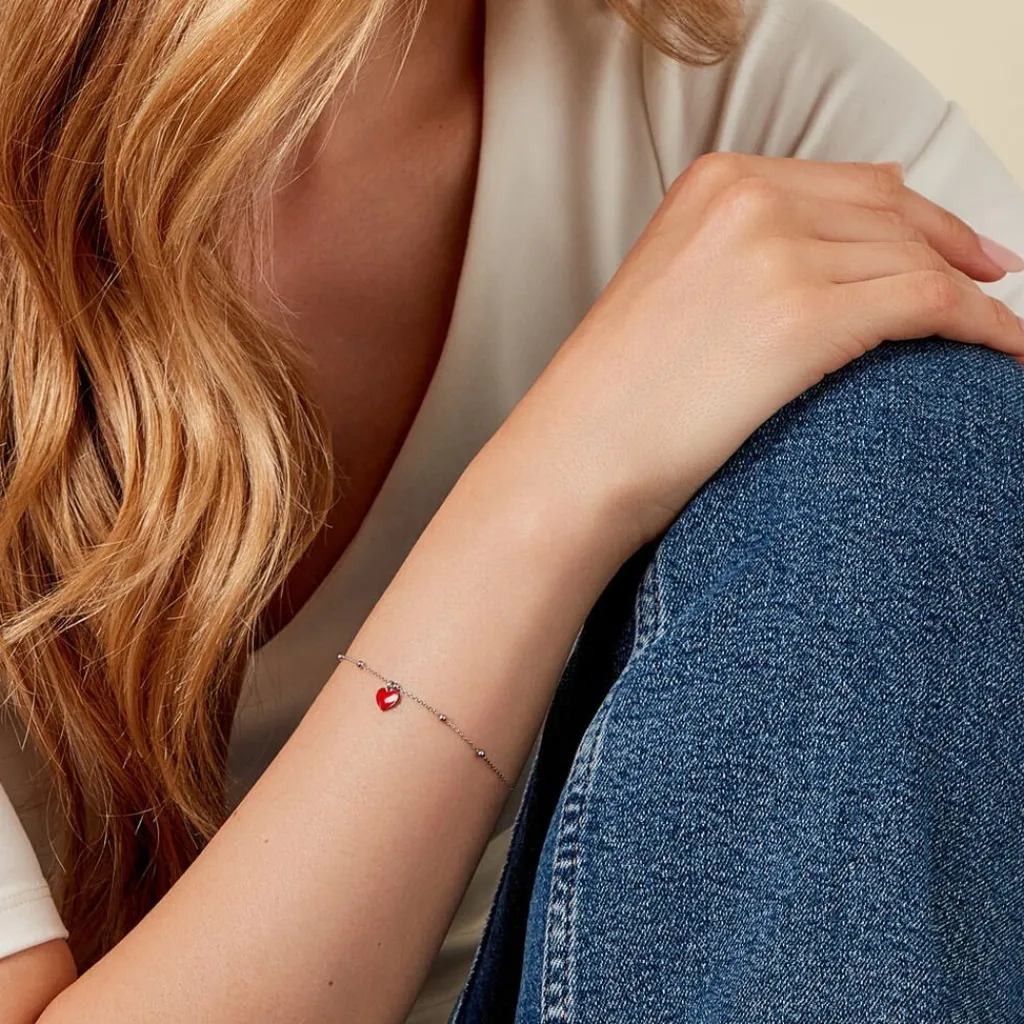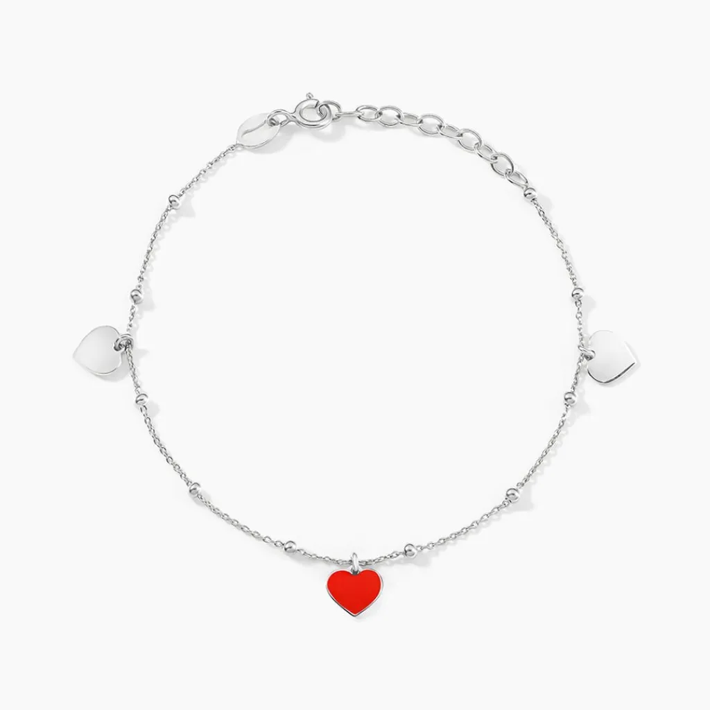 Bracelet Argent Blanc 925/1000 Pampilles C艙urs émail Rouge Maille Boules 16+3cm