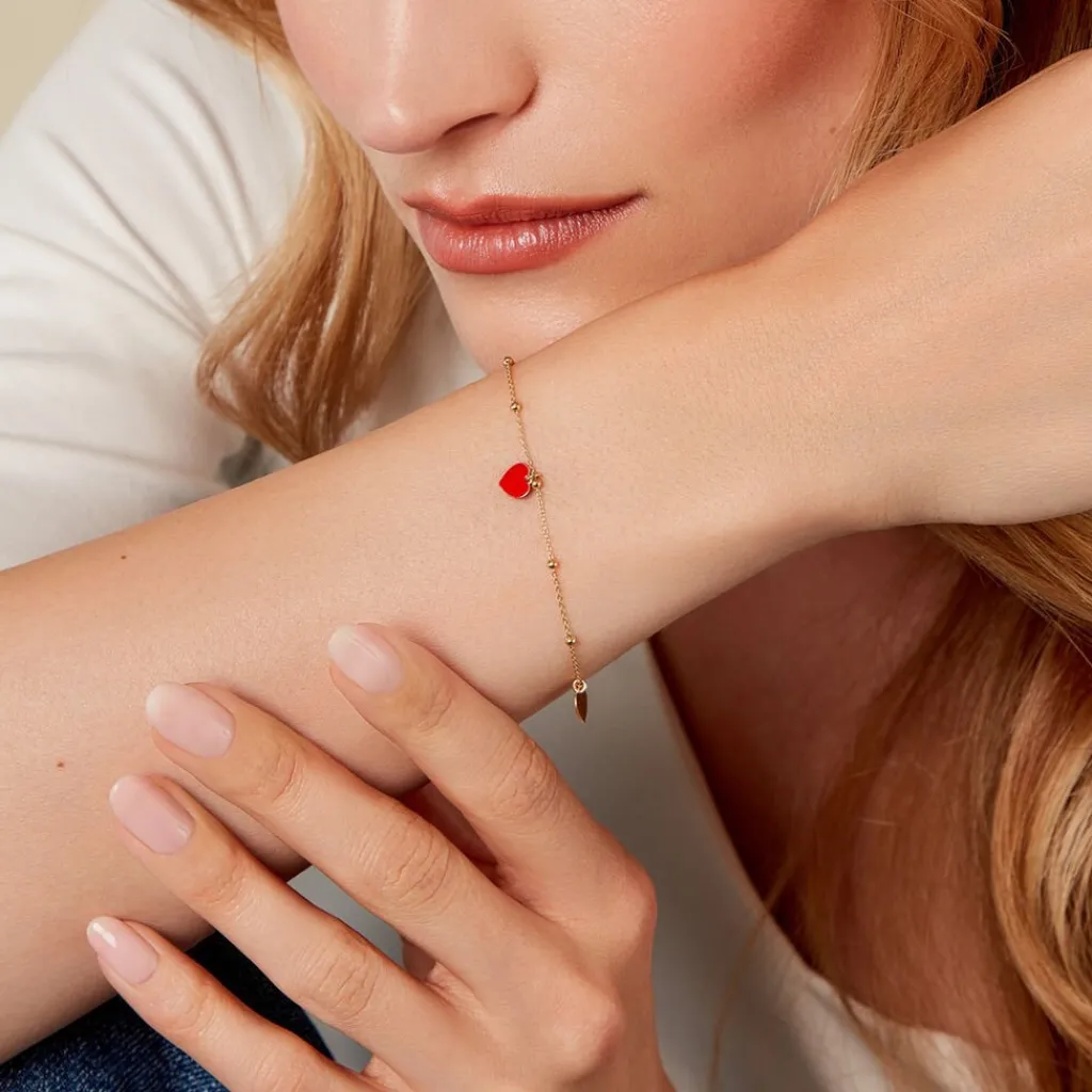 Bracelet Argent Jaune 925/1000 Pampilles C艙urs émail Rouge Maille Boules 16+3cm