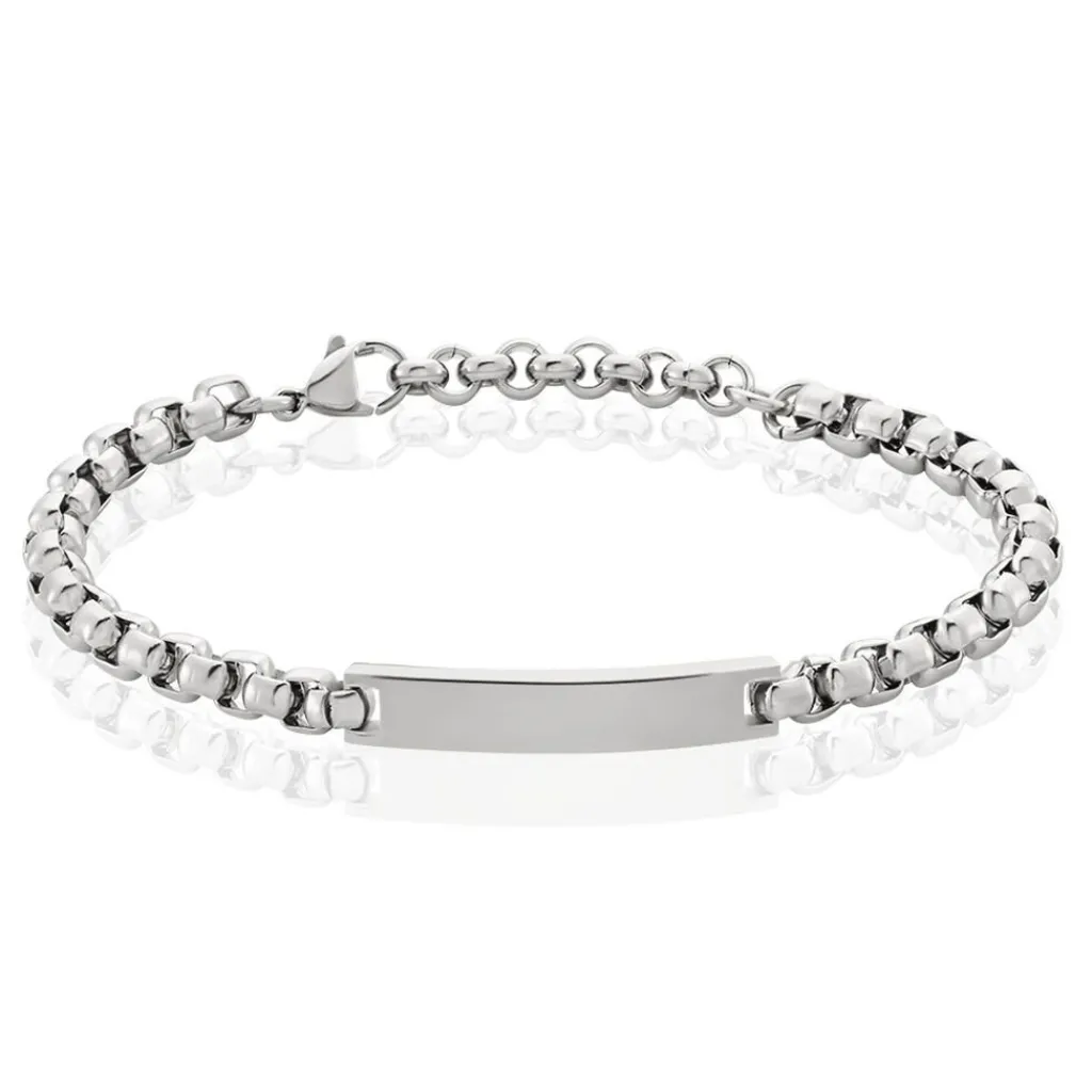 Bracelet Identite Acier Inoxydable Blanc Plaque Lisse Maille Jaseron Largeur 5mm 21cm