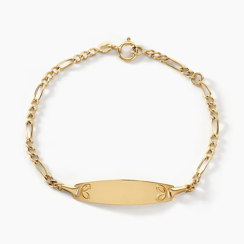 Bracelet Identite Bebe Or Jaune 375/1000 Plaque Ovale Motif Feuilles Maille Alternee 1/3 12/14cm