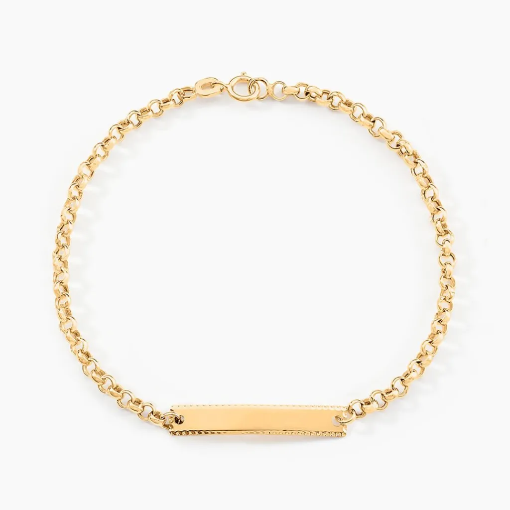 Bracelet Identité Bébé Or Jaune 375/100 Plaque Rectangle Contour Ciselé Maille Jaseron 16cm