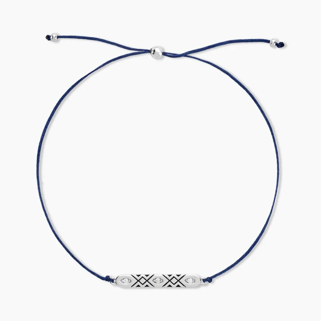 Bracelet Argent Blanc 925/1000 Motif Ethnique Oxydes De Zirconium Cordon Ajustable Nylon Bleu 23cm