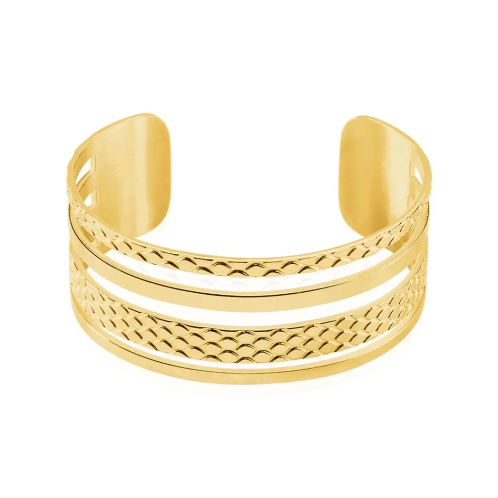 Bracelet Manchette Acier Inoxydable Jaune Ouvert 4 Anneaux Larges Ajoures Alternes Lisses Et Reptile Pm