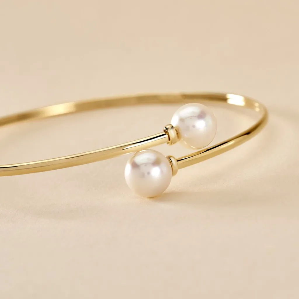 Bracelet Or Jaune 375/1000 Jonc Flexible Avec Double Perles De Culture Blanches