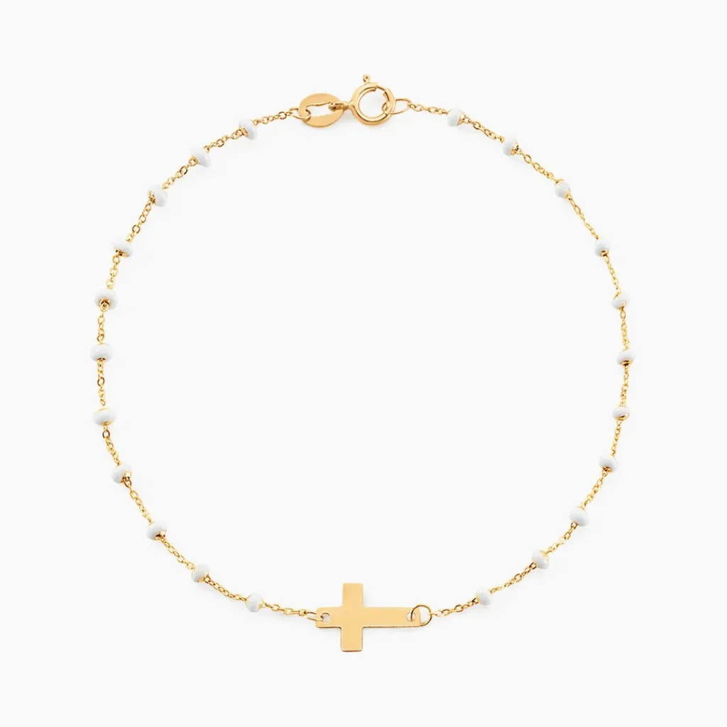 Bracelet Or Jaune 375/1000 Croix Et Email Blanc Boules Maille Fantaisie 16+2cm