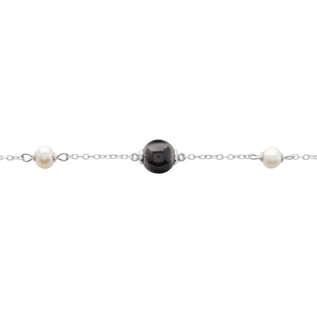 Bracelet Argent Blanc 925/1000 Perles De Culture Et Boules Ceramique Noire Maille Forcat 19cm