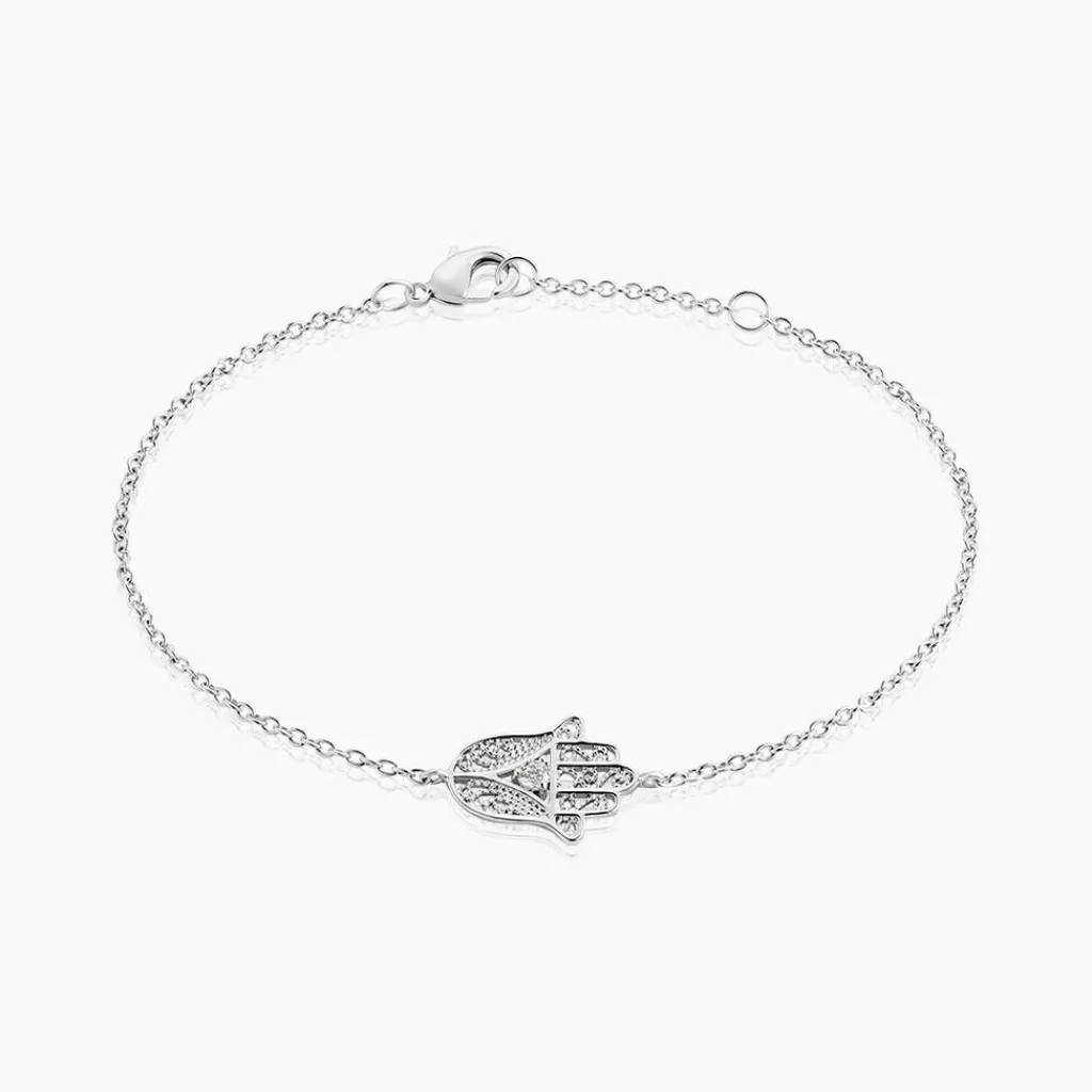 Bracelet Argent Blanc 925/1000 Main De Fatma Oxyde De Zirconium Blanc 0.12 Cts Serti 3 Griffes 16+2cm