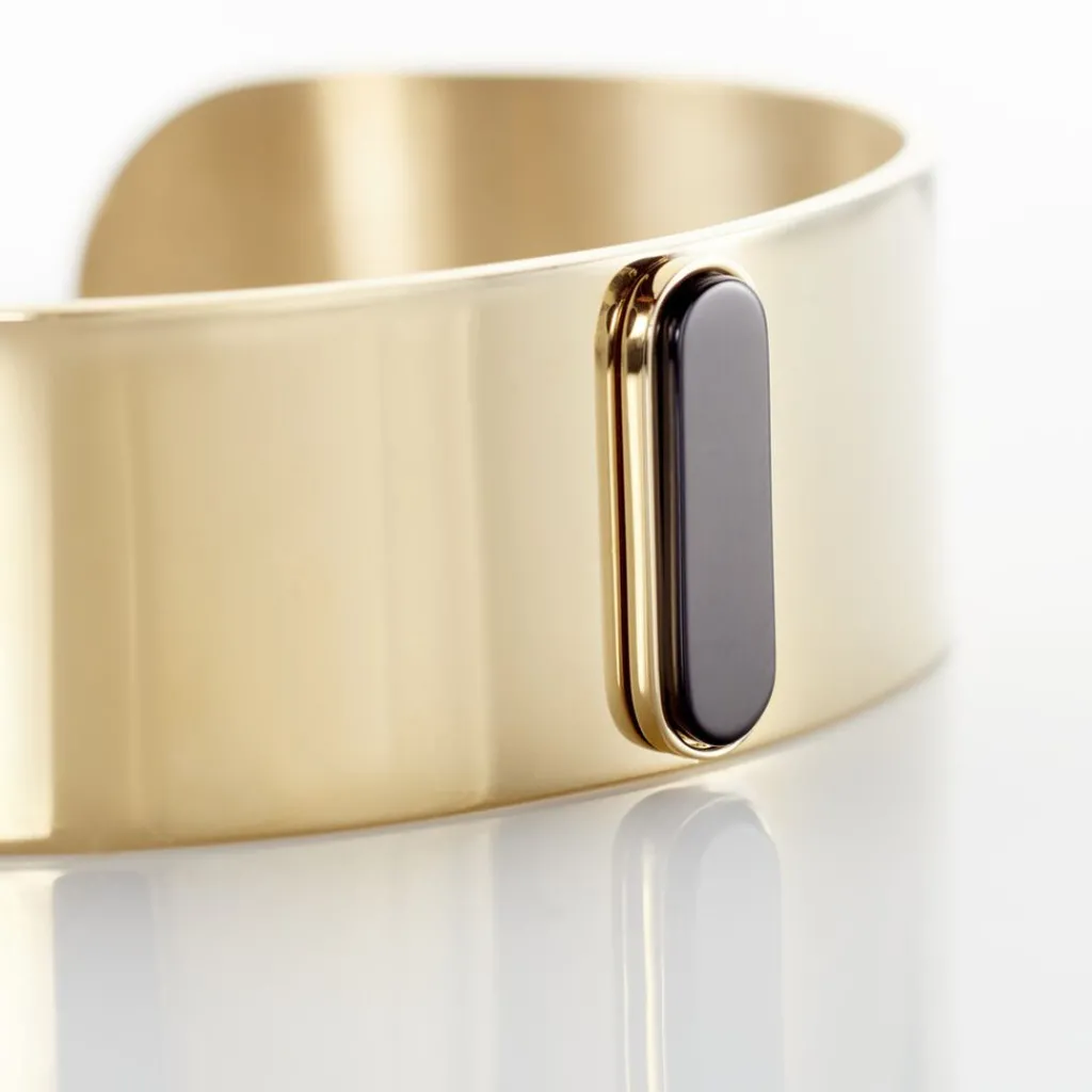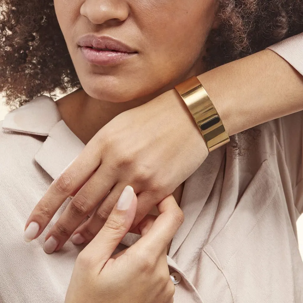Bracelet Manchette Acier Dore Barrette Agate Noire Diametre 60mm