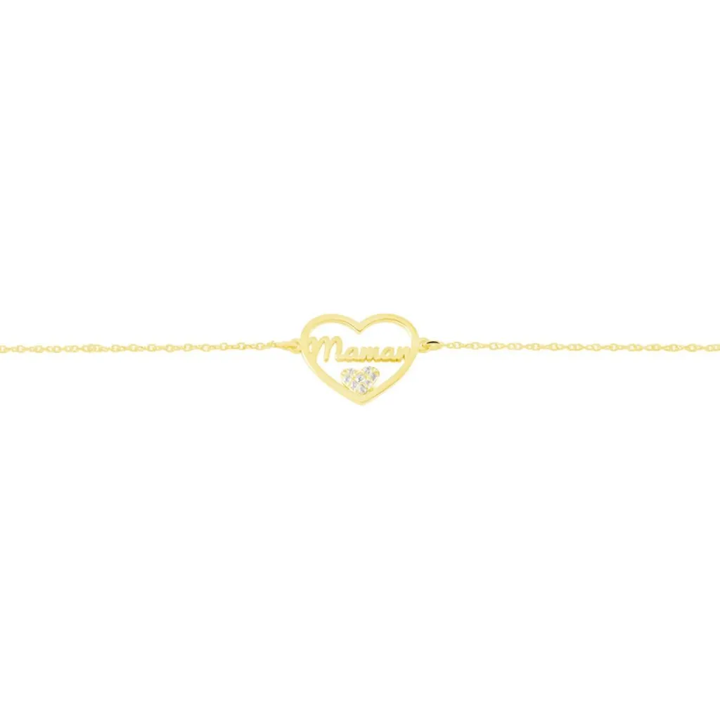 Bracelet Or Jaune 375/1000 Coeur Ajoure Message Maman + C艙ur Pavage Oxyde De Zirconium Maille Jaseron 16+2cm