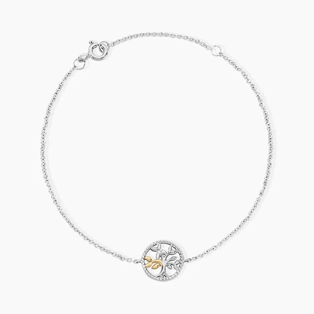 Bracelet Or Jaune 375/1000 Et Argent Blanc 925/1000 Arbre De Vie Cercle Maille Jaseron 16+3Cm