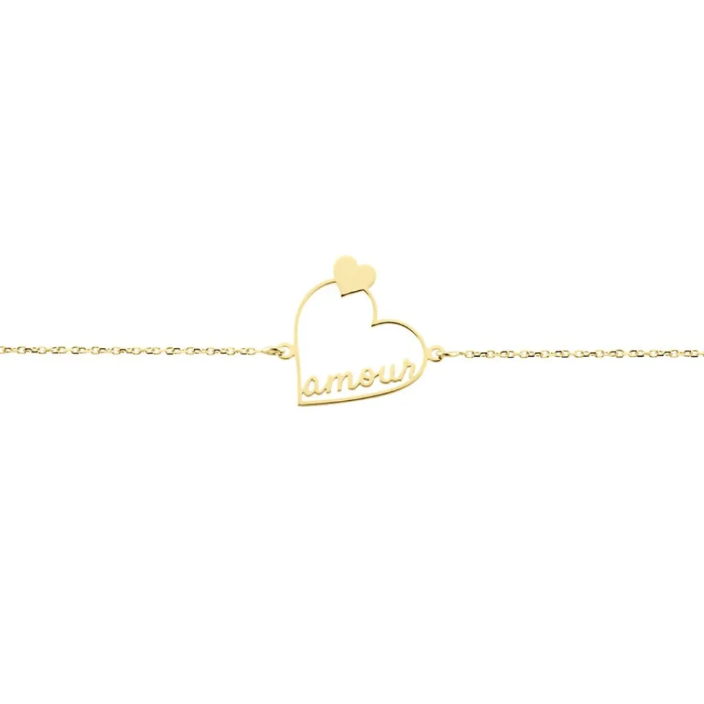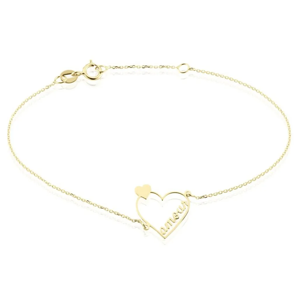 Bracelet Or Jaune 375/1000 Grand C艙ur Ajoure Et Petit C艙ur Plein + Message Amour Maille Jaseron 16+2cm