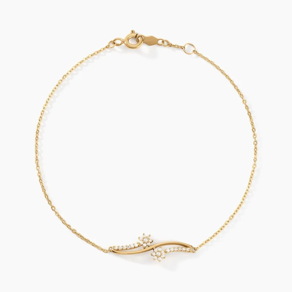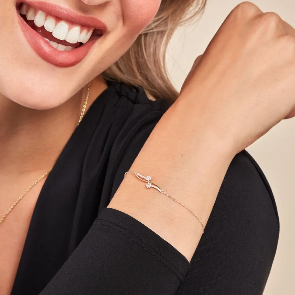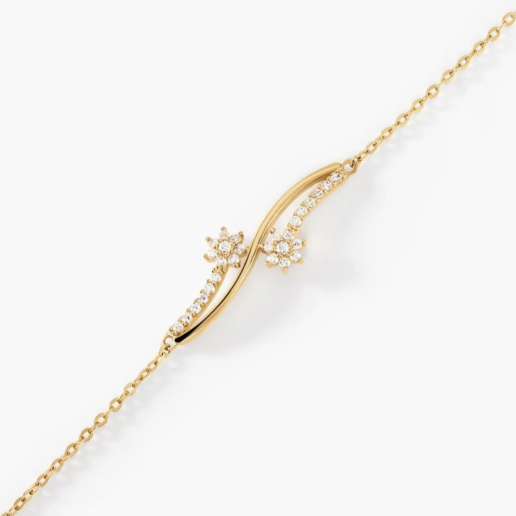 Bracelet Or Jaune 375/1000 Double Etoile Filante Vague Oxyde De Zirconium Pavage Maille Forcat 16+2cm