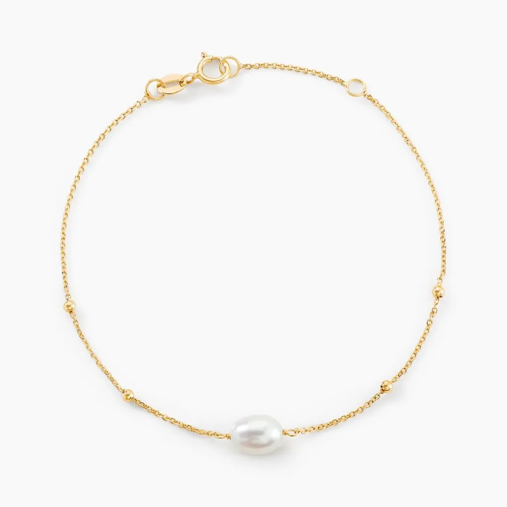 Bracelet Or Jaune 375/1000 1 Perle De Culture Ovale 6×4.5mm Maille Forcat Boules 16+2cm
