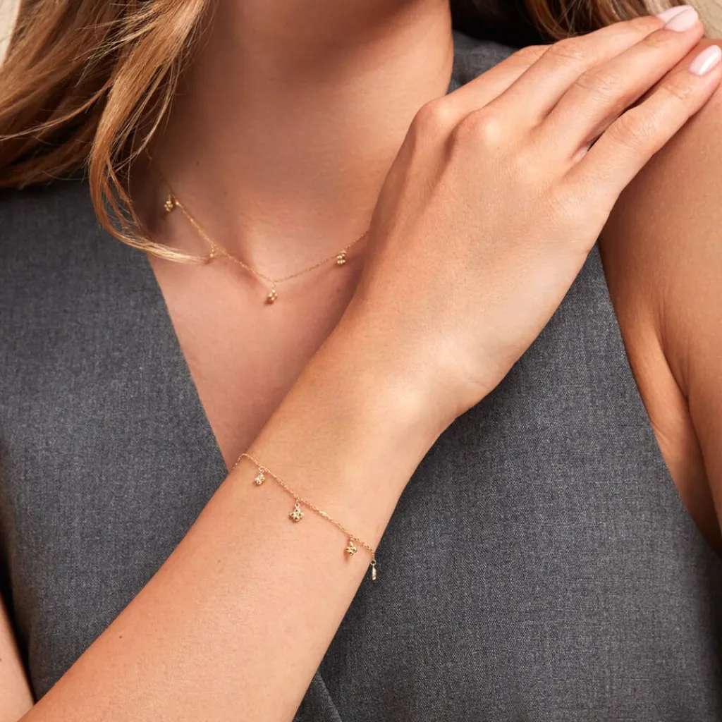 Bracelet Or Jaune 375/1000 5 Pampilles Fleurs Boules Maille Jaseron 16+2cm