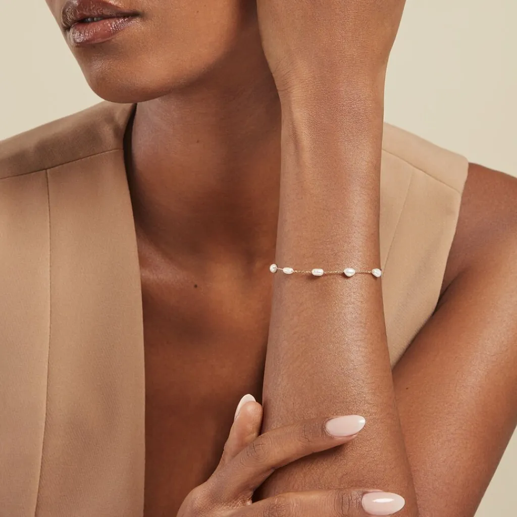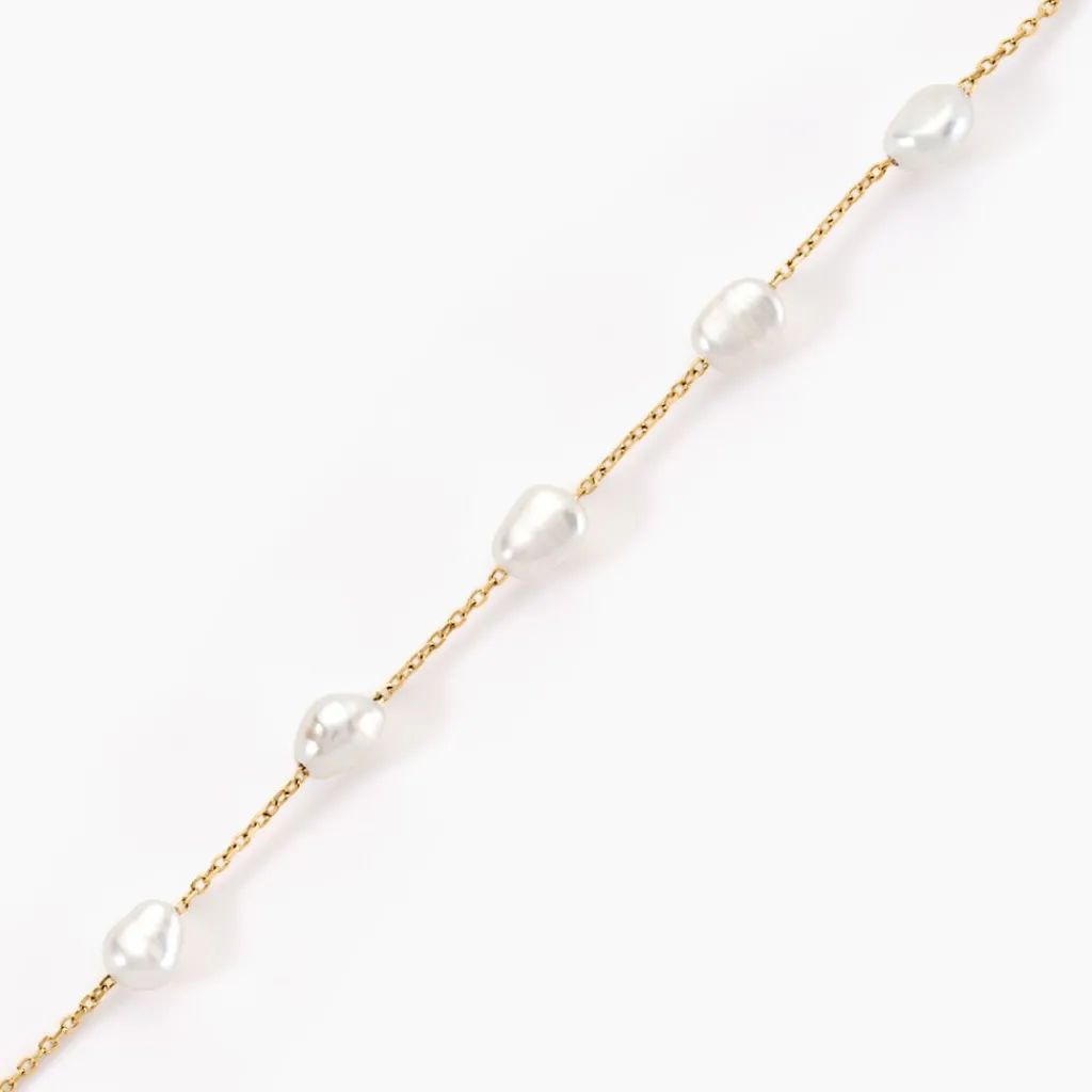 Bracelet Or Jaune 375/1000 Persephone 5 Perles De Culture Blanches Ovales 4/5mm Maille Forcat 16+2cm Bio0439k-g-x1