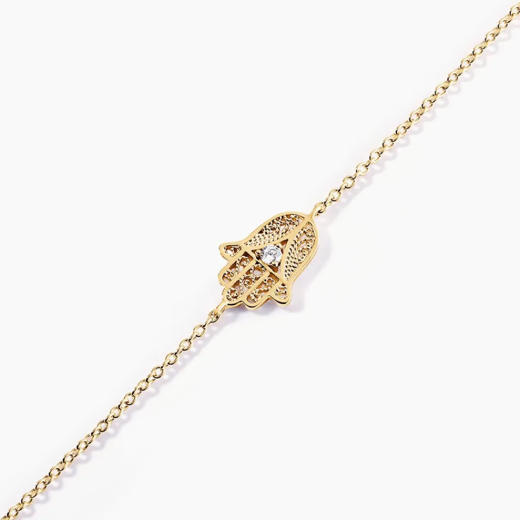 Bracelet Plaque Or Jaune Main De Fatma Oxyde De Zirconium Maille Forcat 16+2cm