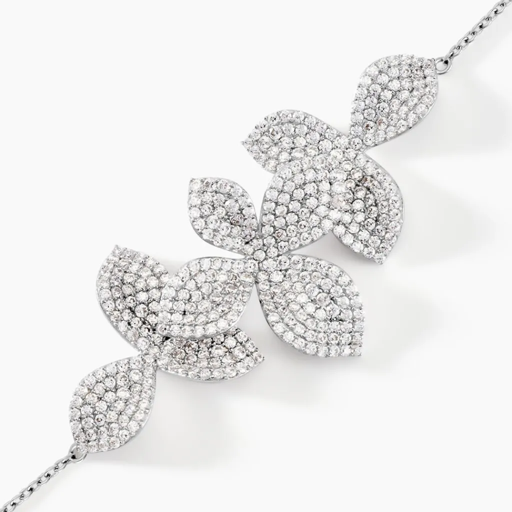 Bracelet Argent Blanc 925/1000 3 Fleurs Pavage Oxydes De Zirconium Maille Forçat 16+3cm