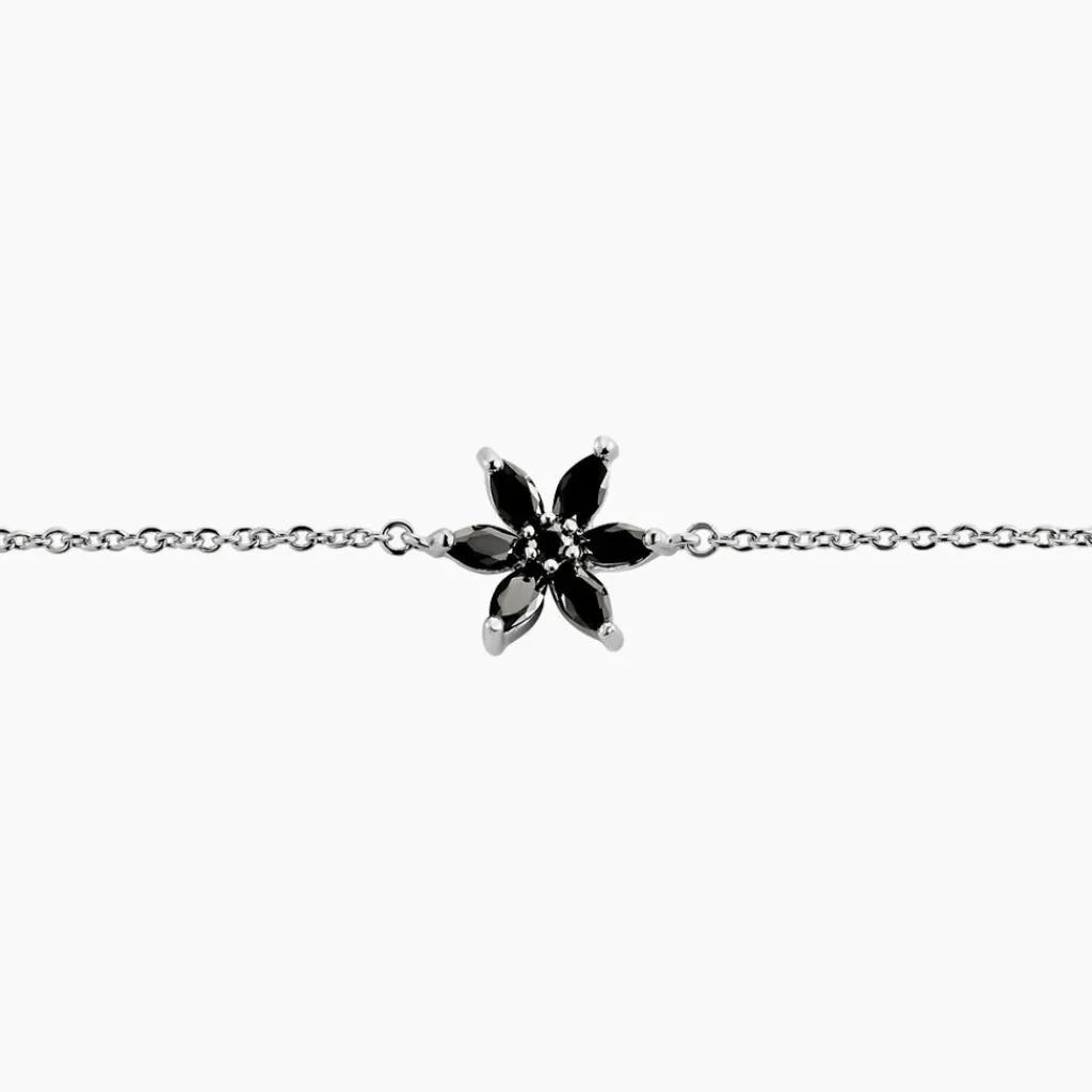 Bracelet Argent Blanc 925/1000 Fleur Oxydes De Zirconium Noirs Maille Jaseron 16+2cm