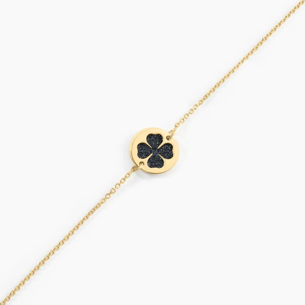 Bracelet Or Jaune 375/1000 Pastille Glitter Noir + Pastille Ajouree Motif Trefle Maille Jaseron 16+2cm