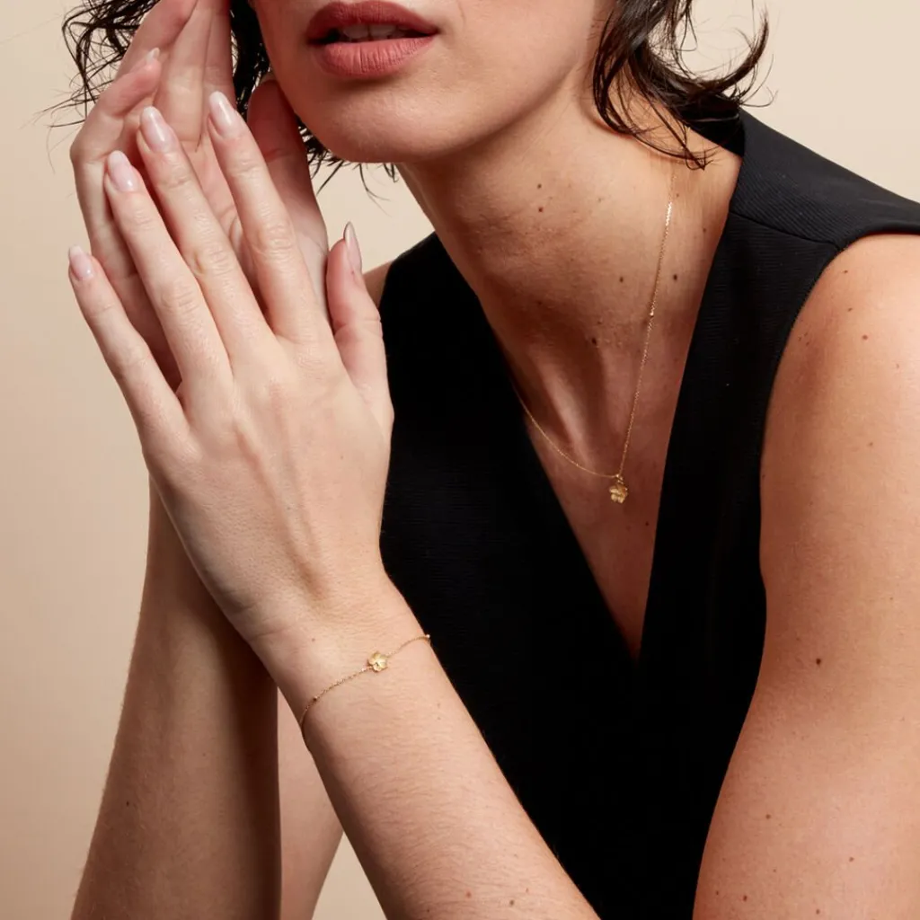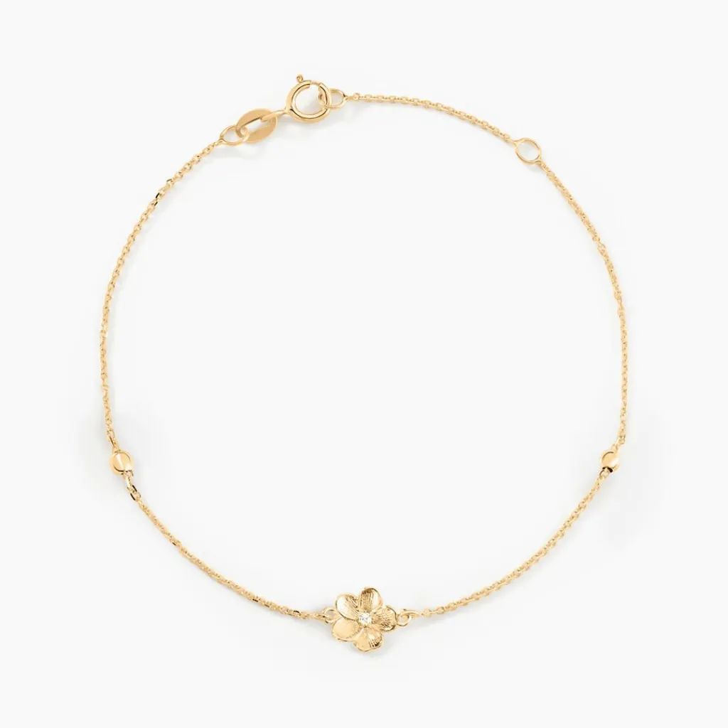 Bracelet Or Jaune 375/1000 Fleur Oxyde De Zirconium Serti Griffes Et 2 Petites Boules Maille Jaseron 16+2cm