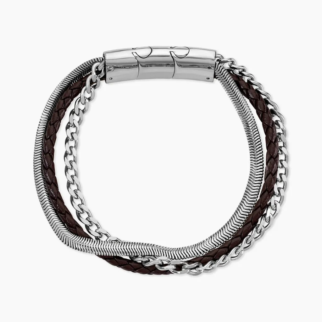 Bracelet Acier Inoxydable Blanc Cordon Tresse Cuir De Vache Marron Et Maille Gourmette Largeur 5Mm 21Cm