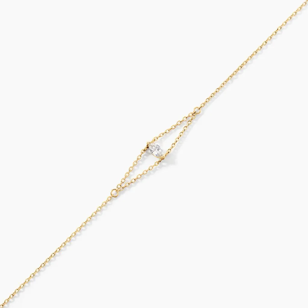 Bracelet Or Jaune 375/1000 Jamsheed Solitaire Navette Oxyde Double Chaine Maille Forcat 16+2Cm BNH0015K-G-CZ-S1