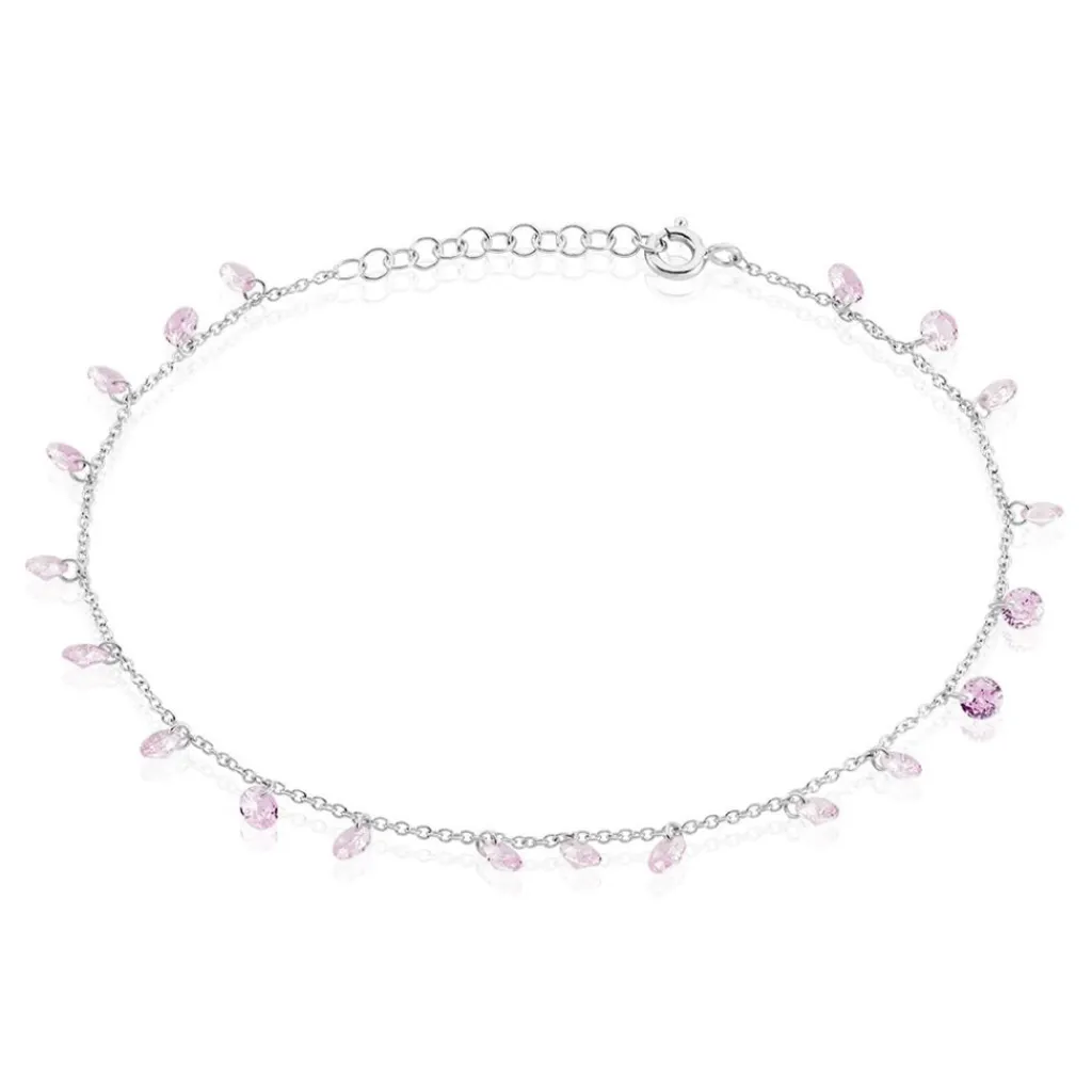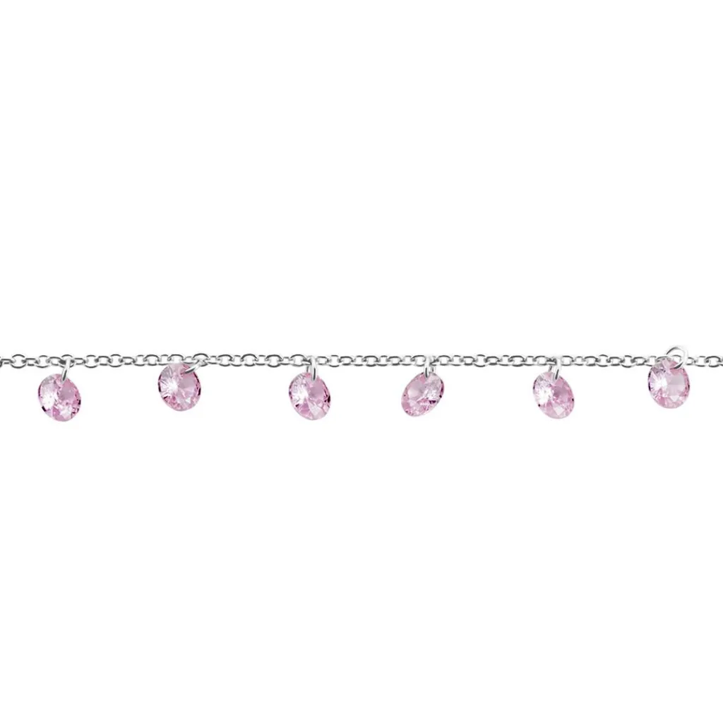 Chaîne De Cheville Argent Blanc 925/1000 Pampilles Oxydes De Zirconium Roses Maille Forçat 25cm