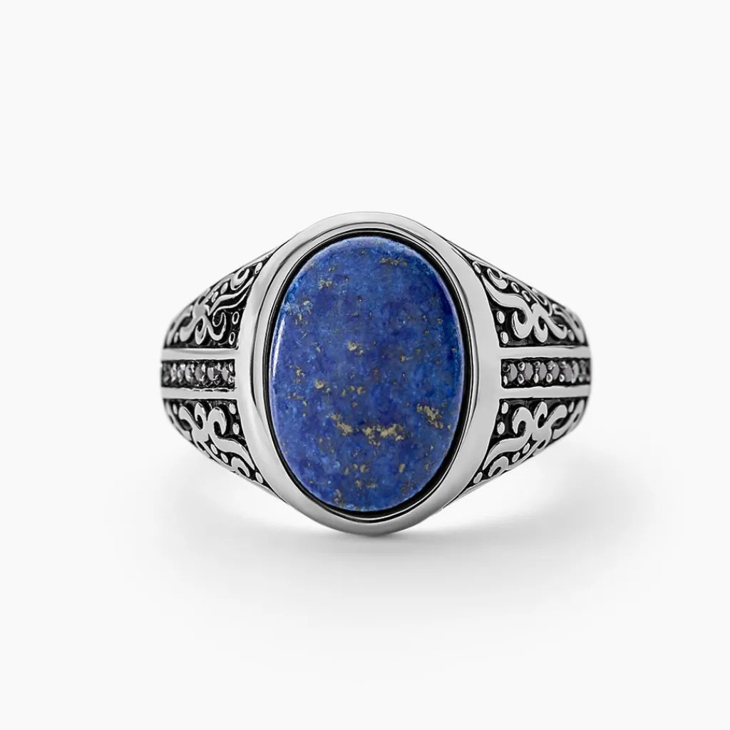 Chevalière Acier Inoxydable Blanc Aspect Vieilli Plateau Ovale Lapis Lazuli