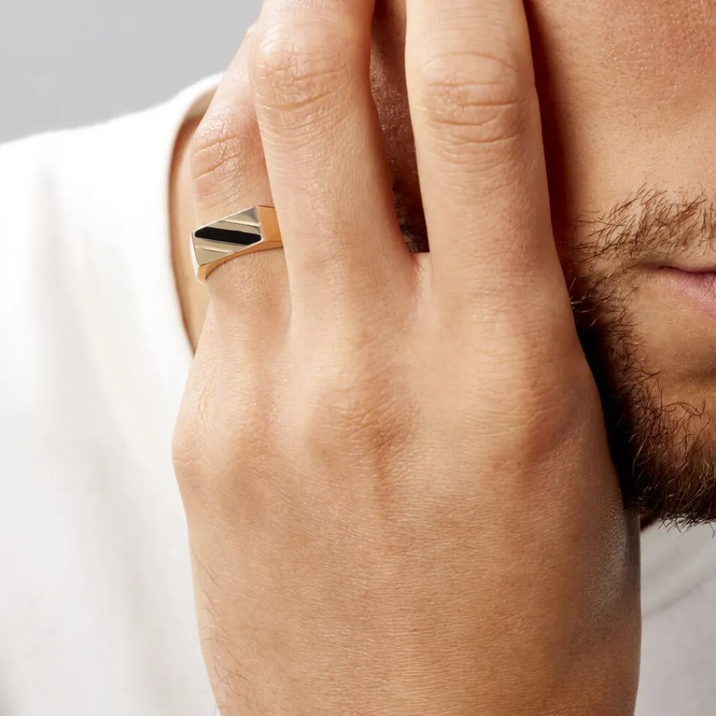 Chevalière Plaqué Or Jaune Forme Rectangulaire Striee Email Noir