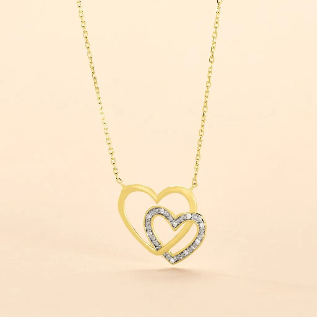 Collier Or Jaune 375/1000 Double C艙ur Pavage Diamants Maille Forcat 40+2cm