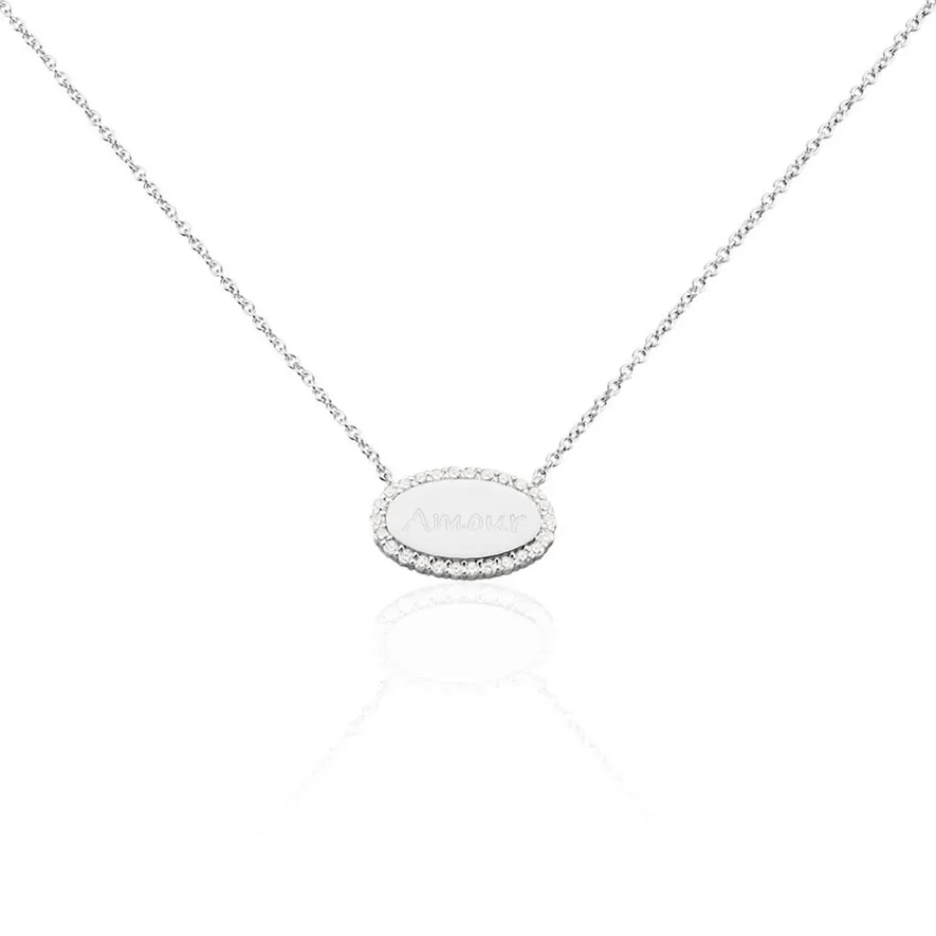 Collier Argent Blanc 925/1000 Pastille Ovale Message Amour Entourage Oxydes De Zirconium Maille Forçat 45cm