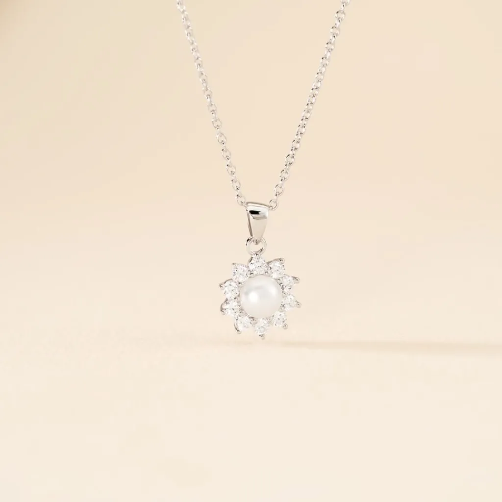 Collier Argent Blanc 925/1000 Fleur Perle De Culture Et Oxydes De Zirconium Sertis Griffes Maille Forçat 45cm