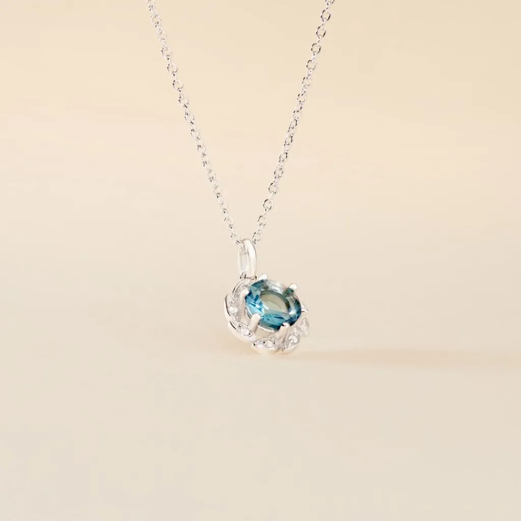 Collier Argent Blanc 925/1000 Fleur En Verre Bleu Serti 6 Griffes Et Oxydes De Zirconium Maille Forçat 44cm
