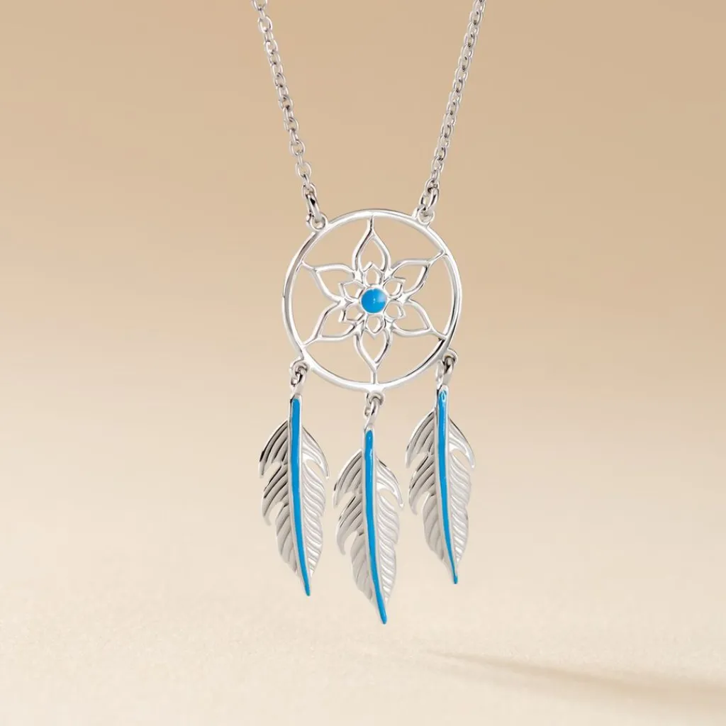 Collier Argent Blanc 925/1000 Attrape Rêves Email Bleu Maille Forcat 45cm