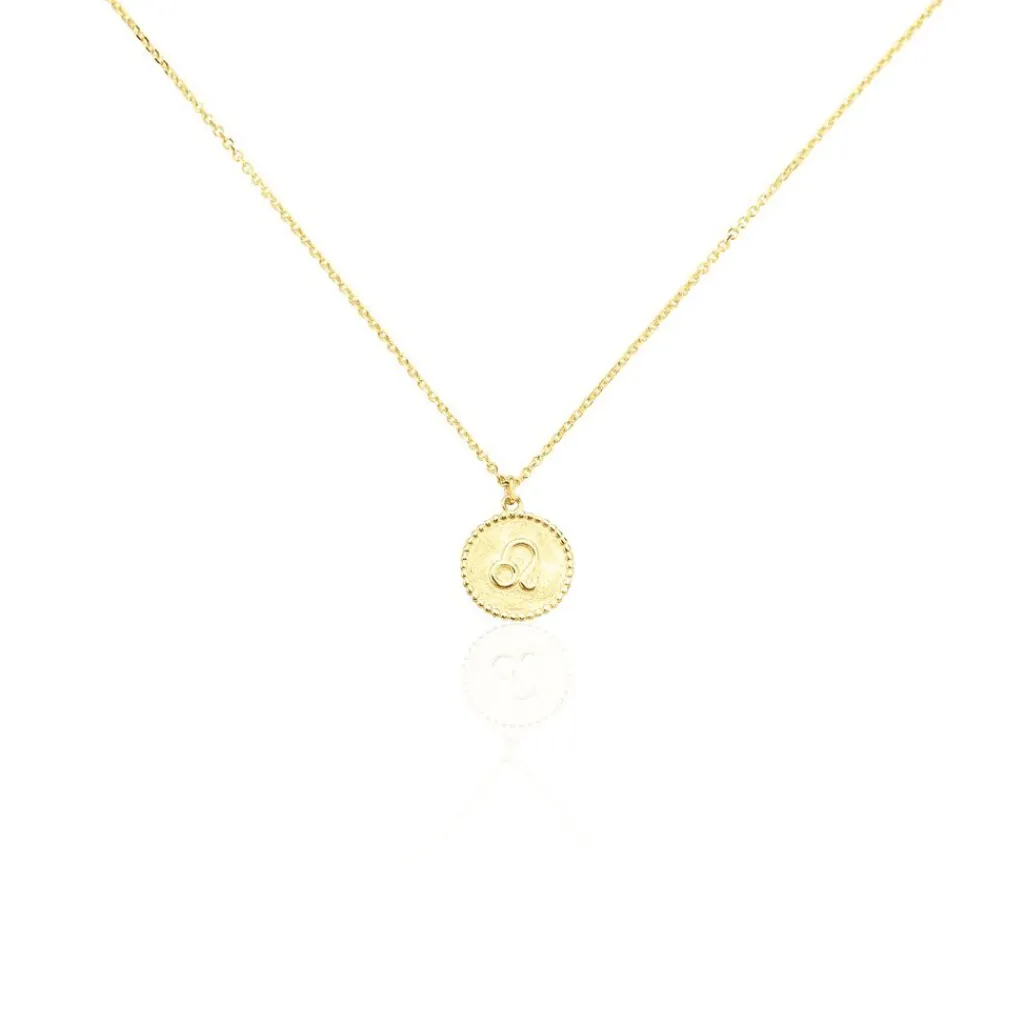 Collier Or Jaune 375/1000 Pastille Zodiaque Lion Brosse Effet Perlee Maille Jaseron 40+2cm