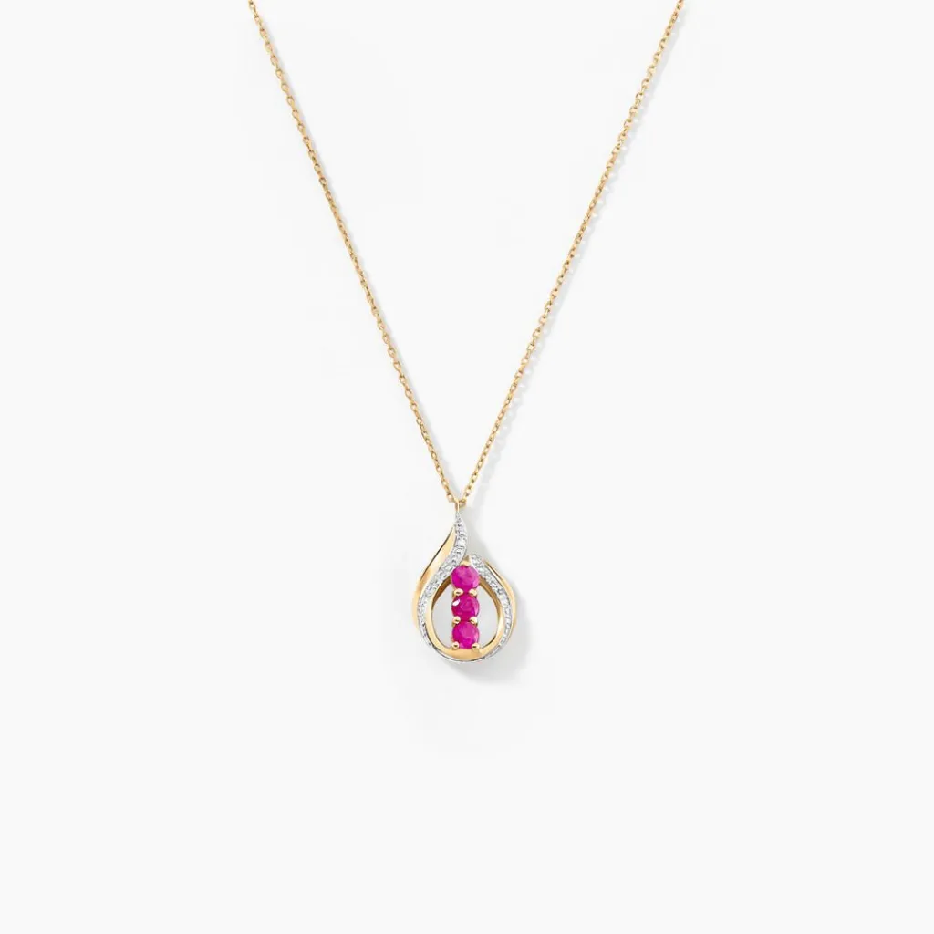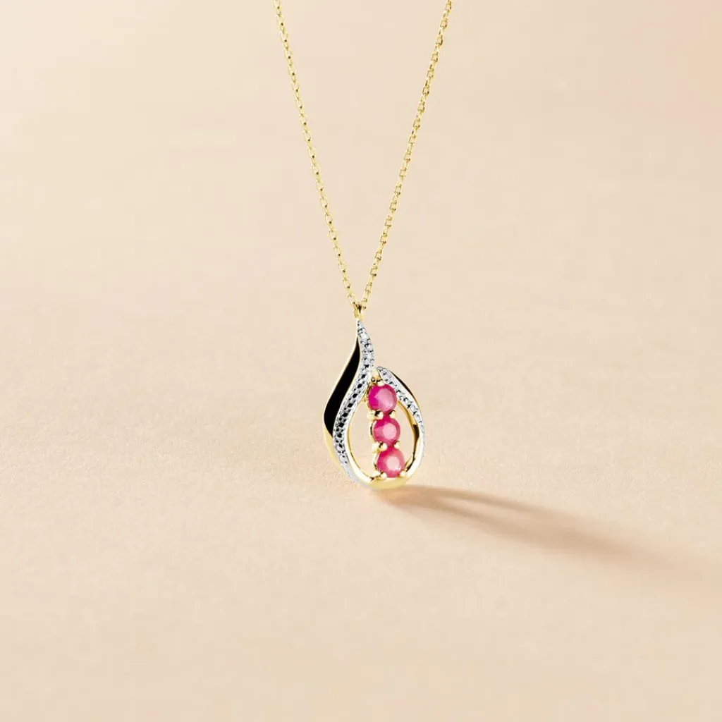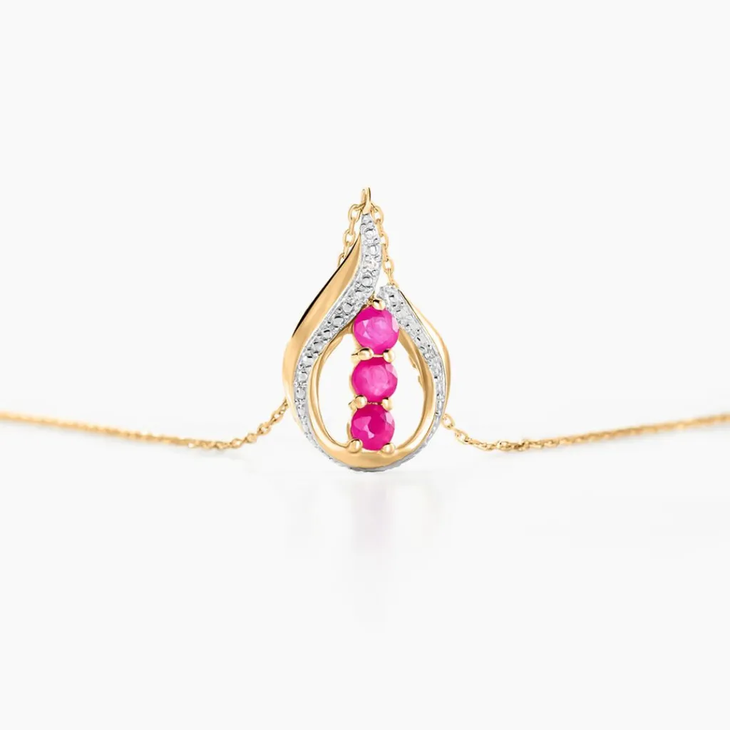 Collier Or Jaune 375/1000 Trilogie Rubis Et Diamants 43cm