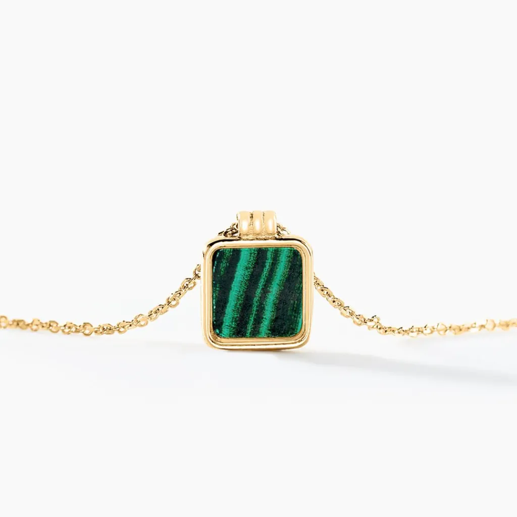 Collier Or Jaune 375/1000 Carre Malachite Verte Serti Clos Maille Jaseron 40+2cm