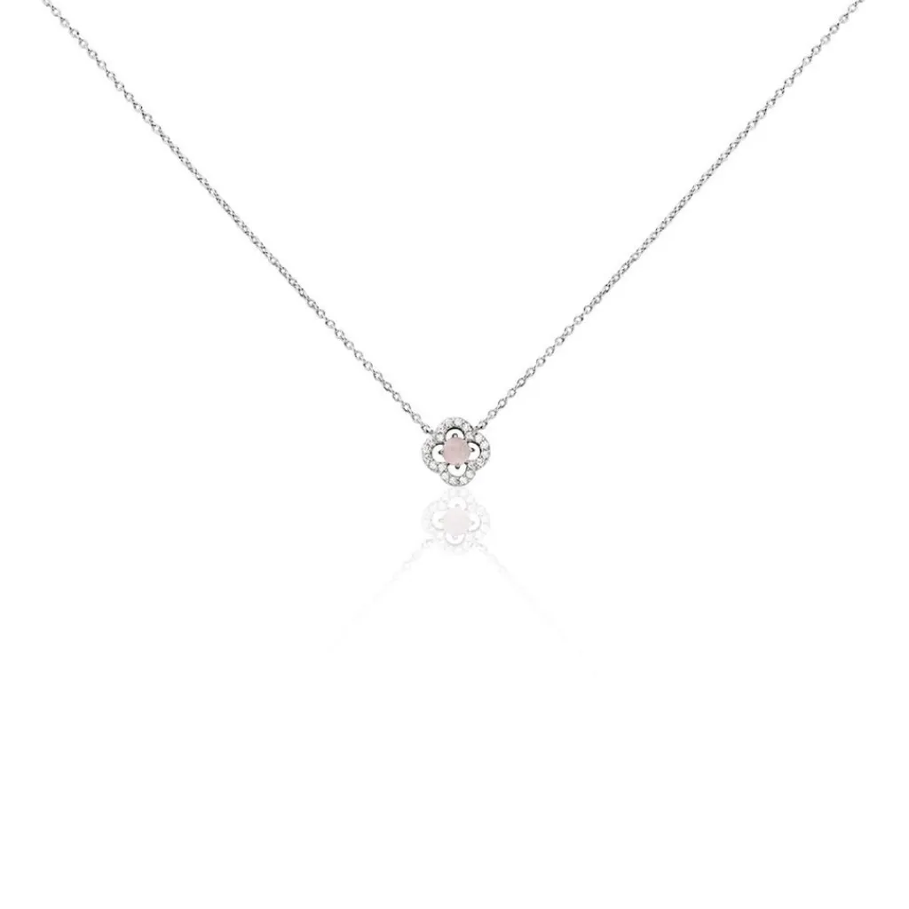 Collier Argent 925/1000 dally Fleur Quartz Rose Entourage Oxydes De Zirconium Maille Forcat 45cm