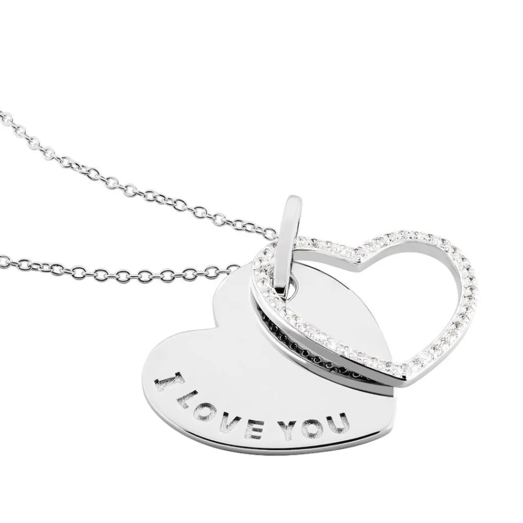 Collier Argent Blanc 925/1000 Double C艙ur Grave I Love You Et Pave D’oxydes De Zirconium 45cm