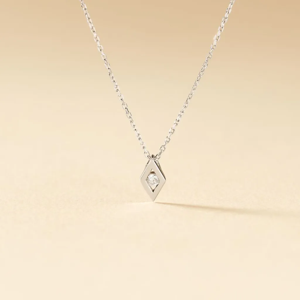Collier Or Blanc 375/1000 Motif Losange Diamant Central 0.033ct 42cm
